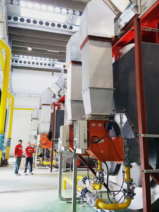 為一個燃氣調節站的四臺蒸汽式鍋爐安裝了 4 臺 13MW 的非標 IB 1200 ME PG 燃燒器。 這些燃燒器配有燃氣點火先導裝置,符合 ZONA ATEX1 標準。 系統功率:52 MW